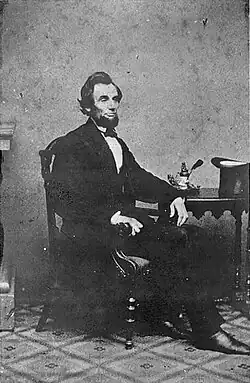 May 16, 1861[93] Mathew Brady[94] Carte-de-visite printed from one frame of the lost original multiple-image stereographic negative[95] Library of Congress President Abraham Lincoln, seated next to small table, in a reflective pose, May 16, 1861, with his hat visible on the table.[96]