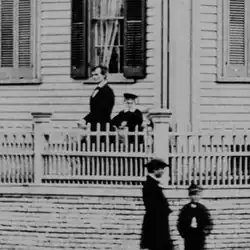 This photo clearly shows Abraham Lincoln and his son Willie standing behind the fence. A close look reveals that the youngest son Tad is peaking from behind the corner post. The identity of the people in front on the walkway is not known.[48]