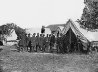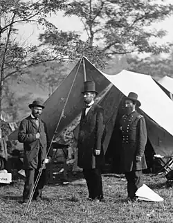 Alexander Gardner[101] Cropped digital file from original wet collodion glass negative Lincoln with Allan Pinkerton and Major General John A. McClernand at Antietam.[102] The photograph was taken in front of the headquarters tent of the U.S. Secret Service.[103]