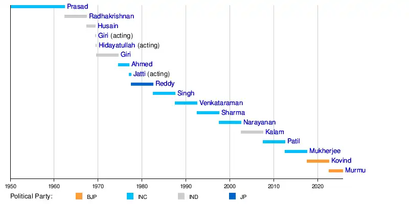 Droupadi MurmuRam Nath KovindPranab MukherjeePratibha PatilA. P. J. Abdul KalamK. R. NarayananShankar Dayal SharmaRamaswamy VenkataramanZail SinghNeelam Sanjiva ReddyB. D. JattiFakhruddin Ali AhmedV. V. GiriMohammad HidayatullahV. V. GiriZakir Husain (politician)Sarvepalli RadhakrishnanRajendra Prasad
