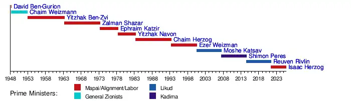 - ^ David Ben-Gurion preceded Weizmann as Chairman of Provisional State Council, a position which he held from 14 to 16 or 17 May 1948. Weizmann's position remained as Chairman of Provisional State Council until 17 February 1949, when he was declared President by the first Knesset. Upon Weizmann's death on 9 November 1952, Knesset Speaker Yosef Sprinzak took over as Acting President of Israel until the inauguration of Yitzhak Ben-Zvi.