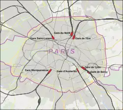 These stations are the terminal stations of major lines (trains going beyond the Île-de-France region), and, except for Bercy, the suburban Transilien lines. Austerlitz, Saint-Lazare, Lyon and Nord are also stations on the RER network. All stations connect to stations of the Paris Métro.
