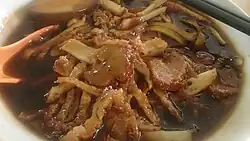 | Bubur ayam[41] | Indonesia | A porridge of rice and shredded chicken, served with soy sauce, spices, fried shallots, cakwee (fried dough), krupuk (a type of cracker), and sambal (a hot sauce); often eaten for breakfast[42] | |