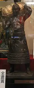 Nara Prefectural Governor's Award | The trophy is a bronze statue of a sumo wrestler. It was created based on the mosaic wall painting of the former National Stadium of Nara-city. The pedestal is decorated with a Nara traditional lacquerware craft and with patterns inspired by the Shōsōin treasures. It is 84 cm (2 ft 9 in) high, 5 cm (2 in) wide and weighs 15 kg (33 lb).[37] | Nara Prefecture | 2014