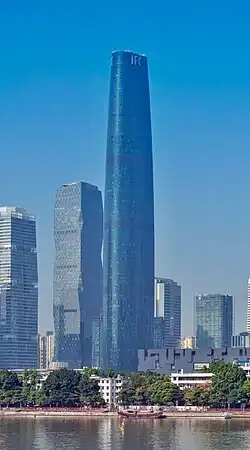 1 Guangzhou CTF Finance Centre 530 m (1,739 ft) 120 2016 Previously called the Guangzhou East Tower. One half of the Guangzhou Twin Towers. 3rd-tallest building in China and 8th-tallest building in the world. It also houses the world's fastest elevators, which can reach speeds up to 21 m/s (69 ft/s).[4]