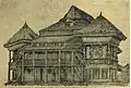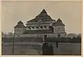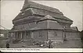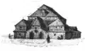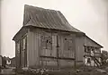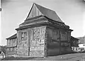 Ros', Grodno 1700s???? A photograph from the beginning of the 20th century shows that it was also a two-tiered building. Its core consisted of a ritual room close to a square. At the level of the first tier, auxiliary rooms were located under a pitched roof, covering the main volume along the perimeter. In comparison with Leonpol synagogue, this one was approximately twice as large in volume. The length of the walls at the level of the first tier was about twenty meters, and at the level of the second - about twelve. The walls were made of hewn beams, in a clean corner, and had horizontal planking. The windows in the upper tier were high, doubled, with bow-shaped ends, with wide platbands. They sat symmetrically about the vertical axis of the building. The entire building ended with a high roof with a wide baroque pediment, sheathed with herringbone planks, with an arched window with six glass panes. The roof had a tattered covering, which also created a colorful texture and was in contrast to the smoothly sheathed walls.[4]