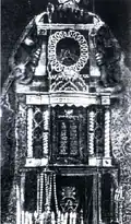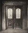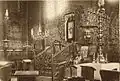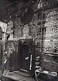 1814–1972 The rectangular wooden building consisted of the high, almost square prayer room for the men and, in front of it, the vestibule, above which the prayer room for the women was located. This had narrow openings to the main hall, as well as a gallery for a choir. A staircase led from the vestibule to the women's rooms and (through this) to the gallery. A narrow extension to the west was the same height as the whole building and led to the vestibule. The men's prayer room had two rectangular windows on three sides to the north, east and south; the two floors of the vestibule and women's room had two smaller windows on each side. The roof was two-tiered with a mansard roof and above it a hipped roof that merged into a gable roof. The narrow extension to the west had a gable roof. During the alterations and renovations after the First World War, the rectangular windows were replaced by arched windows and the extension in the west was demolished and a portico with a gable roof was built in its place. The walls were (mainly) decorated with floral ornaments. The bima was a simple table covered with a tablecloth. There were fixed rows of seats for the assembled. The Torah shrine consisted of four levels that tapered towards the top and were framed by columns. The Torah scrolls themselves were on the second level behind a carved folding door. Above were the tablets of the law. Among them was a saying from the Talmud. This was very unusual as the Karaites only refer to the Torah and reject the Talmud. The Torah shrine was probably made by a member of Rabbinic Judaism, as their own community was too small to find a skilled craftsman.[42]