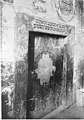 18001941 The main hall was 10.80 × 8.60 m tall and had to key of vault m a height of 10.00. You were in the West, the vestibule and a side room in front. Above was the women's prayer room; this was accessible via a staircase along the west wall. The entrance to the main hall for the men was from the south through the adjoining room and vestibule to the prayer room. There were two windows on each of the outer walls of the hall; The adjoining room and the women's gallery each had a smaller, simple window. The roof was a hipped roof that merged into a smaller gable roof at the top. Inside the prayer room had a monastery vault. The walls were painted in color, but the paintings were barely recognizable at the beginning of the 20th century. The Torah shrine stood on a high platform and was decorated with wooden decorations. The octagonal bima stood in the middle of the room.