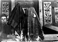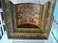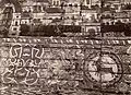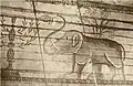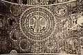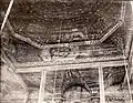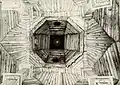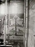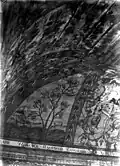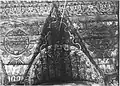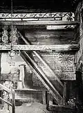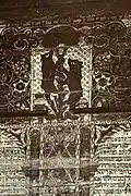17501941 The synagogue building was a wooden structure built on a stone foundation. The walls of were cut from edged logs into a clean corner. The central log house was dominant in height, to which side log houses were adjoined as covered galleries. A pentagonal structure was added to the main facade, which covered the main entrance. The building was covered with a high gable roof, with a complex plan and numerous outbuildings. In the end of 19th - beginning of 20th century the roof was covered with tin.[6] The interior was almost entirely covered with magnificent polychromes made in 1745 by the Słuck painter Chaim ben Yitzchak ha-Levi Segal. Murals, made on boards, represented the images of 12 signs of the zodiac, mythical animals and cities. Some researchers noted that under the image of mythical cities features of Mogilev from the times of the Polish-Lithuanian Commonwealth were visible. These murals were studied by El Lissitzky and Issachar Ber Ryback.
