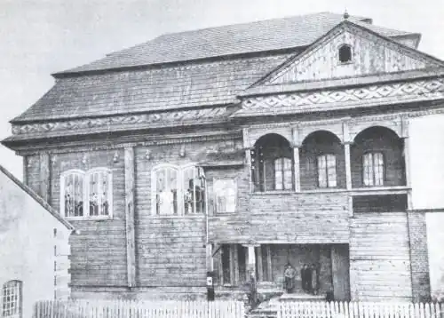 1744–1943 The rectangular synagogue had a hipped roof with a smaller gable on the west. The roof protruded well beyond the building and was supported on all four sides by wooden pillars. In the west there was a vestibule and another room at ground level. This was followed by the main hall, the men's prayer room. Above the vestibule and the adjoining room was the women's prayer room, which was accessible via an outer staircase. In the middle third of the stem was another small stem. The main hall had rectangular windows, the other rooms had smaller, square windows. The bima in the form of an octagonal arbor stood almost in the middle of the main room and was surrounded by a balustrade. The Torah shrine on the east wall was framed by a pair of columns and had a top with a crown. After 2014, a replica was built in the open-air museum for folk architecture in Sanok 150 km away.[34]