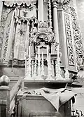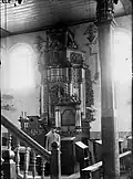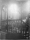 1879–1942 The vestibule was in front of the almost square main hall in the west. Above this there was a gallery for the choir (which protruded somewhat into the main hall), and behind it (separated by a wall) the women's rooms. In front of it was a two-story gallery with the same height. Stairs to the right and left of the gallery led to the first floor and from there to the women's rooms. There were single-storey extensions along the side walls. The gallery was divided into seven fields on the lower level and four on the upper level by supporting beams. The main hall had two pairs of windows in the south (and probably also in the north and east). Inside, the ceiling was supported by four wooden pillars that divided it into nine fields. A two-tier hipped roof covered the entire building (main hall, vestibule, gallery). The roofs of the extensions in the south and north leaned against the walls of the synagogue building. The bima was an octagonal podium with an open-topped dome that was surrounded by a balustrade. She stood between the pillars that supported the ceiling. The Torah shrine was in the form of a cupboard protruding from the wall with columns and floral motifs on the side walls. Above were the tablets of the law. Blessing hands and birds of prey closed it at the top.