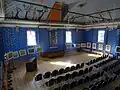17951941 The main hall was almost square with 8.60 × 8.5 m; the walls had a height of 4.30 m. In the west there was a vestibule, which was used as a prayer room in the basement in winter and the women's rooms were on the first floor. In 1903 a side wing was added to the south for additional prayer rooms for women. There were two rectangular windows on each side wall; on the south side they were later covered by the extension. The entire original structure had a two-tier hipped roof with hammer-beam vaults. The gable of the rafter roof of the extension from 1903 stood at right angles to the roof of the main hall. The main hall presumably had a vaulted ceiling at first, but this was later removed so that one could see up to the roof. The main room was decorated with multi-colored paintings. The high Torah shrine was three-tiered and richly decorated. It was separated from the rest of the room by a small door. The bima stood on an octagonal podium near the entrance and had a balustrade with two rows of round balusters standing on top of one another.