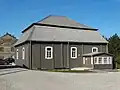The synagogue is a wooden log structure of rectangular plan, built on a rough-stone concrete foundation and divided into two floors in the west. The structure is spanned with a hipped rafter roof covered with tin. On the exterior, the building is protected with horizontal weather-boarding above the windowsills of the prayer hall, and a vertical one below them.[13] A prayer hall of almost square plan is situated on the eastern side. On the western side, the building includes a vestibule and a small room with a stove, which also heated the prayer hall. A staircase in the southwestern corner leads to a women's section on the first floor, which opens to the prayer hall with two long rectangular windows. The main entrance to the building is in the western wall and the women's entrance is on the southern wall. Ten round-headed windows opened from the prayer hall: three windows on the southern and northern walls and two pairs of windows on the eastern wall. The windows of the vestibule and the women's section are rectangular. The ceilings are joisted flat constructions; that of the prayer hall is supported by two large beams, resting on the western wall of the women's section and the eastern wall of the prayer hall.[14]