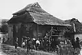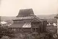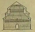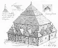 17301941 The main hall was almost square. The entrance was from the south through the vestibule, next to which there was another room. Above that was the area for the women. In later years there were extensions, so there was another women's area along the north side and a two-story corner pavilion in the north-west. There were two windows on each of the outer walls, while those on the north wall were partially covered by the extension. The high roof was two-tiered; below was a hipped roof, and above that, separated by a small wall, another hipped roof that merged into a gable roof.