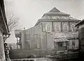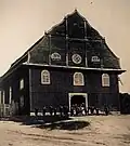 1801[19] Together with another wooden synagogue and a Shtibl, also made of wood, it formed the Shulhoyf; the ensemble survived two fires in the 19th century. The German occupiers detained the Jewish population on the site (July 1941), from where they were brought to Morkakalnis and murdered there. The building ensemble still existed in the post-war period, the Shtibl was demolished in 1970, and the second synagogue before 1997. After being vacant until 1954, the building was used as a cinema until 1971, then a gymnasium, shop and was finally empty again. After a fire in 2009, the wooden building was renovated in 2014. The reopening took place in May 2017 in the presence of the Israeli ambassador and other dignitaries.[20] It was an early classicist wooden building with a mansard roof. The vestibule with the winter synagogue lied in the northwest, above it, slightly protruding and supported by two wooden Doric columns, the women's gallery. The barrel vault was painted around 1895.
