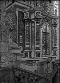 Kórnik, Greater Poland 1767–1940 Of the well-known Polish wooden synagogues, this was the furthest to the west. Its architectural style differs from the other synagogues there and its style was reminiscent of Protestant churches. It is therefore possible that the architect acquired his knowledge in what was then Germany.[30] The dimensions were 18.20 m from west to east and 13.13 m from south to north; the wall height was 5.20 m and inside up to the dome 10.00 m. Access to the vestibule was through a porch framed by pairs of columns with a gable roof that reached to the beginning of the roof of the main building. The two-tier roof consisted of a mansard roof and a hipped roof above. There were four high arched windows on the side walls in the south and north and two each in the west and east. In the south and west there were small rectangular windows underneath. In the mansard part of the roof there were also small round windows with a gable built into it. From the porch three steps led up to the vestibule and from there two more steps down to the main room, the men's prayer room. The gallery for the women was located above the vestibule and along the south wall; this was supported by pillars and protruded into the hall. Access to the gallery was via a staircase in the southwest corner, which was reached there through a door from the outside. In the south-east there was another staircase for an emergency exit. The entire interior had an octagonal dome under which (slightly to the north) stood the Bima. This was framed by an octagonal wooden balustrade. The Torah shrine was not in the middle of the east wall. Because of the women's gallery protruding into the hall, it was offset to the north in the middle between the north wall and the end of the gallery. It was multi-colored, consisted of several levels and was decorated, among other things, with motifs of double-headed eagles, birds of prey and lions. In the middle were the tablets of the law. The Eternal Light (Ner Tamid) was not placed near the Torah shrine, as usual, but was in the northwest corner in the niche of an annex reminiscent of a stove in living rooms. Except for the east wall and the dome, the walls were whitewashed. Plaques with texts were placed under and between the windows.