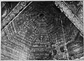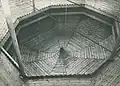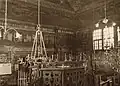 1800–???? The main hall (the men's prayer room) was almost square. Originally there was a room for women along the north wall. This was torn down and the women's room relocated to the west via the vestibule. The entire building was covered by a hipped roof, which merged into a gable roof in the upper half. The eaves were different between the main hall and the vestibule / women's room. This suggests that these two parts were built at different times and then got a common roof. Inside, the men's prayer room had an octagonal, multicolored painted dome. The bima was also octagonal; unlike many others in similar synagogues, however, it did not have a canopy.