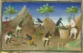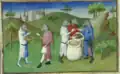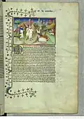 Folio 45r, or The Khan's Money Exchange, shows a scene of trade between a seated khan and three men. The text on the same page, from Marco Polo's Description of the World, describes the novelty of the khan's paper money, noting that traders from far-off locales bring their wares in exchange for these slips of paper. The three men in the image serve as an example of this widespread interest, their hats and clothing suggesting they belong to different cultures. The inspiration for these figure's clothing could have originated from artistic contact between Europe and Asia but most likely originated from Italian art depictions of "Eastern" figures.[3] In either case, this folio serves as record of cross-continental trade.