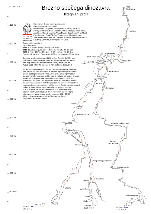 74. ^ Bevc, Jure (2023). "Brezno spečega dinozavra v 2022" [The Abyss of the Sleeping Dinosaur in 2022] (PDF). Glas podzemlja (in Slovenian). Društvo za raziskovanje jam Ljubljana. pp. 47–49. Retrieved 1 April 2024.