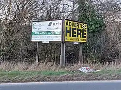 Despite Llandegley having no airfield—much less one of international standard—a visitor to Llandegley, Nicholas Whitehead, erected his own road sign, mimicking the UK's standard Worboys signs, on private land on the north side of the A44 east of Crossgates in 2002, showing "Llandegley International [Airport] / Terminals 1 & 3 / 2½ m".[1][2] He spent £1,000 on renting the site.[2][4]