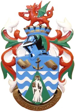 The motto, seen in the coat of arms says "Cyfoeth Cymdeithas: Cymuned", which translates as "A society's wealth is its community".