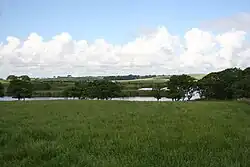 The lake is dominated by tall fen vegetation, especially common reed, although in some areas bottle sedge bogbean, Yellow flag iris and greater pond sedge are locally dominant and there are patches of common club-rush, reed canary-grass, reedmace and greater tussock-sedge. Species which are uncommon on the island or in northern Wales include Lesser water-plantain, greater spearwort and lesser tussock-sedge occur locally within the fen. The parts of the site which are dominated by purple moor-grass host a diverse flora including petty whin and large populations of saw-wort. Where lime-rich springs emerge, blunt-flowered rush is common and grass of Parnassus and marsh helleborine are found alongside it.[2] It is one of only three sites on Anglesey where the short-spiked bladder sedge had been recorded according to Hugh Davies 1813 book in the island's botany,[4] however, this species has since been shown to be more widespread.[5]