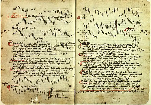 The song manuscript comprises 45 songs in one-part to three-part settings on 93 pages. 44 songs are in German, one is Dutch.[1] Other sources arrive at 47[2] or 50 songs.[3] The differences in numbering come from some songs existing in several versions; some melodies are fragmented or without text or title. For almost half of the songs, the book is the only source.
