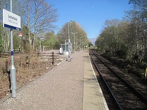 Locheilside railway station is a railway station on the northern shore of Loch Eil in the Highland Council Area of Scotland. This station is on the West Highland Line, between Glenfinnan and Loch Eil Outward Bound, located 7 miles 79 chains (12.9 km) from the former Banavie Junction near Fort William.[3] ScotRail, who manage the station, operate all services.