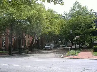 Lockerbie Square is the oldest intact residential neighborhood of Indianapolis. Lockerbie is located on the northeast side of Alexander Ralston's Plat of Indianapolis at the intersection of East Street and New York Street.[4] The western border of the district is East Street, so named as it was the original eastern boundary of Indianapolis.[5] The neighborhood is directly south of the Mass Ave Cultural District and north of the Cole-Noble District. At only 34 mile (1.2 km) away from Monument Circle, Lockerbie Square was one of Indianapolis' earliest walkable suburbs.
