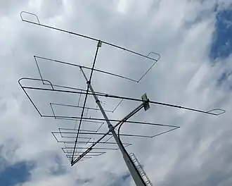 Every element in the LPDA antenna is a driven element, that is, connected electrically to the feedline. A parallel wire transmission line usually runs along the central boom, and each successive element is connected in opposite phase to it. The feedline can often be seen zig-zagging across the support boom holding the elements.[2] Another common construction method is to use two parallel central support booms that also acts as the transmission line, mounting the dipoles on the alternate booms. Other forms of the log-periodic design replace the dipoles with the transmission line itself, forming the log-periodic zig-zag antenna.[3] Many other forms using the transmission wire as the active element also exist.[4]