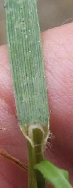 The plant is a low-growing, tufted, hairless grass, with a bunching (or tillering) growth habit. The leaves are dark green, smooth and glossy on the lower surface, with untoothed parallel sides and prominent parallel veins on the upper surface. The leaves are folded lengthwise in bud (unlike the rolled leaves of Italian ryegrass, Lolium multiflorum) with a strong central keel, giving a flattened appearance. The ligule is very short and truncated and often difficult to see. The small white auricles grip the stem at the base of the leaf blade. Leaf sheaths at the base are usually tinged pink and hairless. Stems grow up to 90 cm.[2]