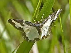 Lomaspilis species have a wingspan reaching 24–28 millimetres (0.94–1.10 in). Males have simple or fasciculate-ciliate antennae. Forewings have convexly curved outer margins. They are usually white or ochreous white, with dark bands and blotches. Hindwings usually are showily patterned. The basic color is white or ochreous white, with a dark fuscous marginal band. In the early stages larvae feed on willows (Salix species).[1][2]