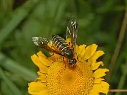 The adults grow up to 10–13 millimetres (0.39–0.51 in) long. Body is shining black. In males the thorax shows black hairs, tawny in females. The wings have a wide brown band close to costal margin. The abdomen is black, with yellow bord of the segments, except the first segment.[4]