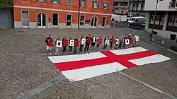 The Saint Ambrose's Cross (often referred to as the most famous St. George Cross) is used by most independence and autonomy parties,[39] some of them also use the flag of the Duchy of Milan (called Ducale),[40] the Camunian rose (official flag of the Lombard region)[41] or a flag inspired by federalist movements of 1848, with St. Ambrose's Cross superimposed by green.[42][43] There is also the idea of using a flag with both the red cross and the Biscione of the House of Visconti.[44][45]