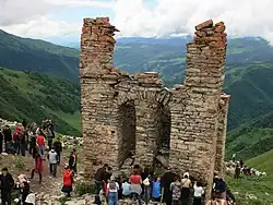 The Lomisa church hosts an annual festival, known as Lomisoba (literally, "of/related to Lomisa"), probably a remnant of an ancient pre-Christian cult superimposed by the veneration of St. George. Every year, on the Wednesday after Pentecost,[9] thousands of people from various regions of Georgia, especially Mtiuleti, Khevi, and Khevsureti, make a pilgrimage up to the Lomisa church. There are specific rituals for healing the sick and for seeking fertility for childless women. There is a round dance performed, with a song that describes the legend of the heavy chain that hangs in the church and is worn by pilgrims.[9] The festival also features a large-scale ritual animal sacrifice, in which hundreds of livestock, especially sheep, are slaughtered down in the valley, not far from the church. In the 2010s, the tradition has been increasingly criticized by animal rights activists, but the locals have rejected the calls to abandon it. The Georgian Orthodox clergy have stated that the Church "prefers unbloody sacrifice" but does not forbid the tradition of animal killing and concomitant supra (feast).[10][11]