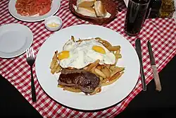 Lomo a lo pobre, bistec a lo pobre, or bife a lo pobre is a dish from Chile. The ingredients are beef tenderloin (Spanish: lomo) topped with one or more fried eggs and French fries.[1][2] Unlike steak and eggs, lomo a lo pobre is eaten as a lunch or dinner.