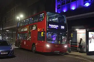 London Buses route 99 is a Transport for London contracted bus route in London, England. Running between Woolwich High Street and Bexleyheath Town Centre (Geddes Place), it has been operated by London Central, a subsidiary of Go-Ahead London, since 18 January 2025 after winning the contract from Arriva London.[1]