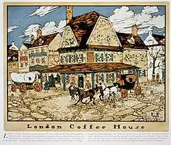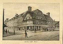 London Coffee House, often called the Old London Coffee House, was a Philadelphia coffee house and merchants exchange in the colonial-era Province of Pennsylvania. Located at the southwest corner of Market (formerly High Street) and Front Streets, it was one block west of the Delaware River waterfront. The coffeehouse was the scene of political and commercial activity, and was the site of slave auctions of Black captives recently arrived from Africa.[1][2]