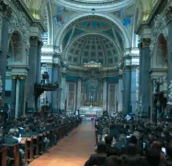 The tradition of marking St Philip's feast day began in 1936.[19] The School celebrates its patronal festival with a Pontifical High Mass in Brompton Oratory on the feast of Saint Philip Neri, 26 May, or on the nearest Friday that falls during Trinity term. The Mass is followed immediately by the distribution of prizes to award winners and the presentation of ties and badges of office to the Senior Prefects by the outgoing Head of School. The official handing over of duties from the outgoing Senior Prefects to the incoming prefects occurs when the badges and ties of office are issued. All members of Staff traditionally wear full academic dress on this occasion.