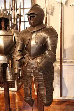 Sir Arthur Haselrig was a prominent leader of the Parliamentary opposition to Charles I during the 1630s. When the First English Civil War began in August 1642, he formed a regiment of "cuirassiers", who wore armour covering most of their body and became known as Haselrig's "London lobsters".[1] They were one of a small handful of similar units, since full armour had largely been abandoned at this time. Most cavalry wore only cuirasses and helmets, while equipping a cuirassier was very expensive. In 1629, a their equipment cost four pounds and 10 shillings, while that of normal cavalry was only one pound and six shillings.[2]