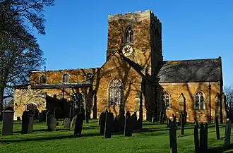 The parish church of St Remigius dates from about the 14th century. Its walls, like those of the nearby manor house, are made of a rich red local stone. It contains a medieval effigy of the crusader William Bozon.[11] The church was restored in 1893 and seats 300.