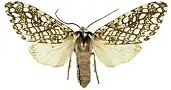 The length of the forewings is about 25 mm. The ground colour is light beige, largely speckled with brown and ornamented with bands of white rounded spots underlined with brown. The basal band formed by a unique spot on the costa. The postbasal, antemedian, median, postmedian and subterminal bands are formed by an alignment of white spots underlined with brown and intercalating between veins. The postbasal band is broken. The antemedian is formed by two white spots and two brown spots. The median band is formed by two spots on the reniform spot. The postmedian is almost straight and complete. The terminal band is formed by irregular white spots sometimes fused with the sinuous subterminal spots. The hindwing is white and semi-translucent. The anal margin is more densely scaled with brown scales. The fringe is checkered white and brownish.[1]