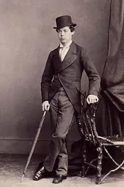In October 1867, Churchill matriculated at Merton College, Oxford. At Oxford, Primrose – now with his own courtesy title of Lord Dalmeny – was along with Churchill a member of the Bullingdon Club, and joined him at the club's champagne-fuelled parties.[4] Randolph was frequently in trouble with the university authorities for drunkenness, smoking in academic dress, and smashing windows at the Randolph Hotel. His rowdy behaviour was infectious, rubbing off on friends and contemporaries; he gained a reputation as an enfant terrible.[5] He had a liking for hunting, but was also a well-read historian. He took a second in jurisprudence and modern history in 1870.[3]
