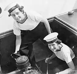Two women of the WRNZNS servicing the engine of a barge