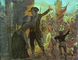 During the so-called 1849 Imperial Constitution campaign, Cantador once again came into the public eye. At the beginning of these riots, on 7 May 1849, the president of the government had again imposed a state of siege on Düsseldorf. On 9 May 1849, the doctor Peter Joseph Neunzig called for open resistance against the Prussian military from Cantador's house on Marktplatz[16] and to support a "provisional government of the Rhenish Republic" founded in Elberfeld (i.e., the Elberfeld uprising).[17] Cantodor did not let Ninety finish his speech, but pushed him away from the window of his house. Until the morning of the following day, bloody barricade fights occurred between members of the vigilantes and Prussian military, resulting in 16 deaths,[18] among them the young painter Ludwig von Milewski. Cantador immediately fled to avoid arrest again.