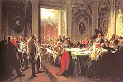 In the genre painting Arbeiter vor dem Magistrat, painted from 1848 onwards, the Düsseldorf painter Johann Peter Hasenclever, who served as an officer in Cantador's civic militia, captured the content and moods of the 1848 revolution by means of a generalised scene in a council chamber. The reference of the scene, however, is concrete. On 9 October 1848, a delegation of 600 unemployed emergency workers, whose labour measures the city of Düsseldorf could not continue to support, submitted a petition to the city hall. The view through the window of the council chamber, whose rococo décor symbolises the outmoded power relations, shows a public mass demonstration at the feet of a Saint George statue adorned with a Schwarz-Rot-Gold flag on a municipal square modelled on the Marktplatz in Düsseldorf.[2]