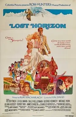 Lost Horizon is a 1973 musical fantasy adventure film directed by Charles Jarrott and starring Peter Finch, Liv Ullmann, Sally Kellerman, George Kennedy, Michael York, Olivia Hussey, Bobby Van, James Shigeta, Charles Boyer and John Gielgud.[3] It was also the final film produced by Ross Hunter. The film is a remake of Frank Capra's 1937 film of the same name, with a screenplay by Larry Kramer. Both stories were adapted from James Hilton's 1933 novel Lost Horizon.