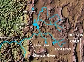 Lost River begins and ends in a closed basin in northern California and southern Oregon in the United States. The river, 60 miles (97 km) long,[4] flows in an arc from Clear Lake Reservoir in Modoc County, California, through Klamath County, Oregon, to Tule Lake in Siskiyou County, California. About 46 mi (74 km) of Lost River are in Oregon, and 14 miles (23 km) are in California.[4]