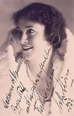 Born in Vienna, Schöne studied music in that city and made her debut in 1912 at the Vienna Volksoper as a bridesmaid in Der Freischütz. From 1917 until 1925 she was on the roster of the Vienna State Opera where she sang all the major light lyric parts. Between 1922 and 1934 she was also a regular at the Salzburg Festival, singing Zerlina, Blonde, and Despina. From 1925 to 1933 she also sang regularly at the Berlin State Opera in roles such as Manon, Mimi, and Cio-Cio-San. For London she created Liù in 1927, her only season at the Royal Opera House. With the rise of the Nazi Party, Schöne moved to Paris and joined the Opéra-Comique, where she was especially noted for her Mélisande. After performances as Marcellina and Zerlina under Bruno Walter at the Paris Opera in 1937, she retired almost completely from the stage.[1] Schöne was of Jewish extraction, and was forced to hide during the German occupation of France during World War II. When she emerged, in 1945, she returned to singing, but almost exclusively in concerts. She retired for good in 1953 and became a voice teacher in Paris.[2] She died in Bobigny.[3]