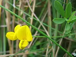 Common names include narrowleaf trefoil,[2] narrow-leaved bird's-foot-trefoil,[3] slender trefoil, creeping trefoil, or prostrate trefoil.